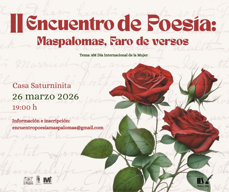 𝗜𝗜 𝗘𝗻𝗰𝘂𝗲𝗻𝘁𝗿𝗼 𝗱𝗲 𝗣𝗼𝗲𝘀𝗶́𝗮 𝗠𝗮𝘀𝗽𝗮𝗹𝗼𝗺𝗮𝘀, 𝗙𝗮𝗿𝗼 𝗱𝗲 𝘃𝗲𝗿𝘀𝗼𝘀La palabra vuelve a iluminar Maspalomas en una cita muy especial con la poesía, dedicada al 𝟴𝗠 – 𝗗𝗶́𝗮 𝗜𝗻𝘁𝗲𝗿𝗻𝗮𝗰𝗶𝗼𝗻𝗮𝗹 𝗱𝗲 𝗹𝗮 𝗠𝘂𝗷𝗲𝗿.